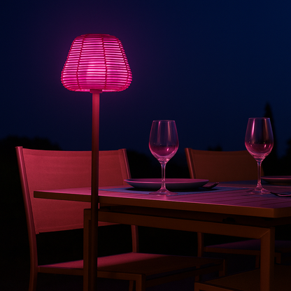 ROBUST: Die 10 cm hohe und 10 cm breite Designer-LED-Leuchte ist spritzwassergeschützt (IP44) und UV-beständig. Der Fuß der Stehleuchte besteht aus Stahl und der Lampenschirm aus Polyrattan.