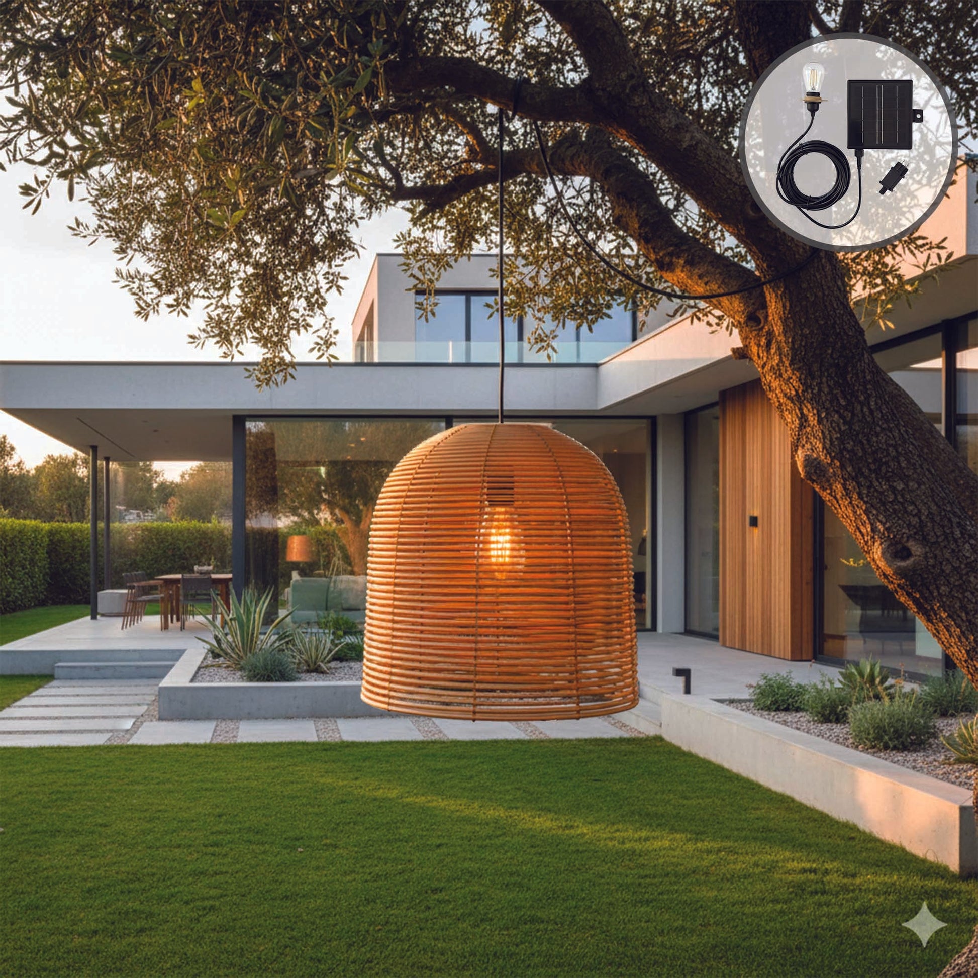 La suspension solaire HANG BOHEME SOLAR 5m de longueur (Dimensions : ⌀ 30 x 31 cm) diffuse une lumière LED blanc chaud et apporte une touche exotique et chaleureuse à votre décoration. Son tressage unique et son style ethnique chic s'intègrent à merveille dans les ambiances modernes, bohèmes ou vintage. La HANG BOHEME SOLAR est fournie avec son câble d'extérieur hybride ENNA SOLAR, doté d'une ampoule LED intégrée et remplaçable. Ce système vous offre la liberté de choix : Par recharge solaire ou secteur 220-240V. L'ampoule offre une puissance lumineuse de 600 lumens et une lumière blanc chaud. De plus, elle est dimmable et propose 4 niveaux d'intensité pour s'adapter parfaitement à l'ambiance souhaitée. Profitez de vos soirées en toute tranquillité. La suspension HANG BOHEME SOLAR bénéficie d'une autonomie exceptionnelle de près de 8 heures une fois chargée au maximum (que ce soit par énergie solaire ou via secteur). Le temps de charge complet est de 6 à 8 heures via solaire. Un voyant de niveau de batterie intégré vous permet de vérifier facilement l'énergie restante. Grâce à sa conception sans fil et son système de recharge hybride, la HANG BOHEME SOLAR est idéale partout : sur votre terrasse, votre balcon, ou dans votre salon. Le poly rotin est un matériau robuste et durable.