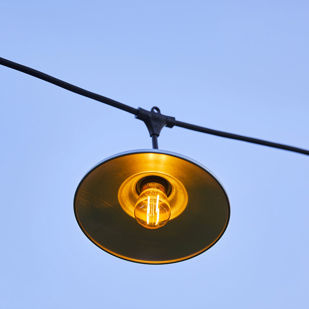 - ROBUST: The original Bowl Galva Light string lights, splash-proof (IP64) and also UV-resistant, have a total length of 6m. The lampshade has a diameter of 19cm. This string light is made up of 10 long, smoked, warm white LED filament bulbs that will create a warm atmosphere. There are 40cm between each bulb and 2.15m from the plug to the first bulb.