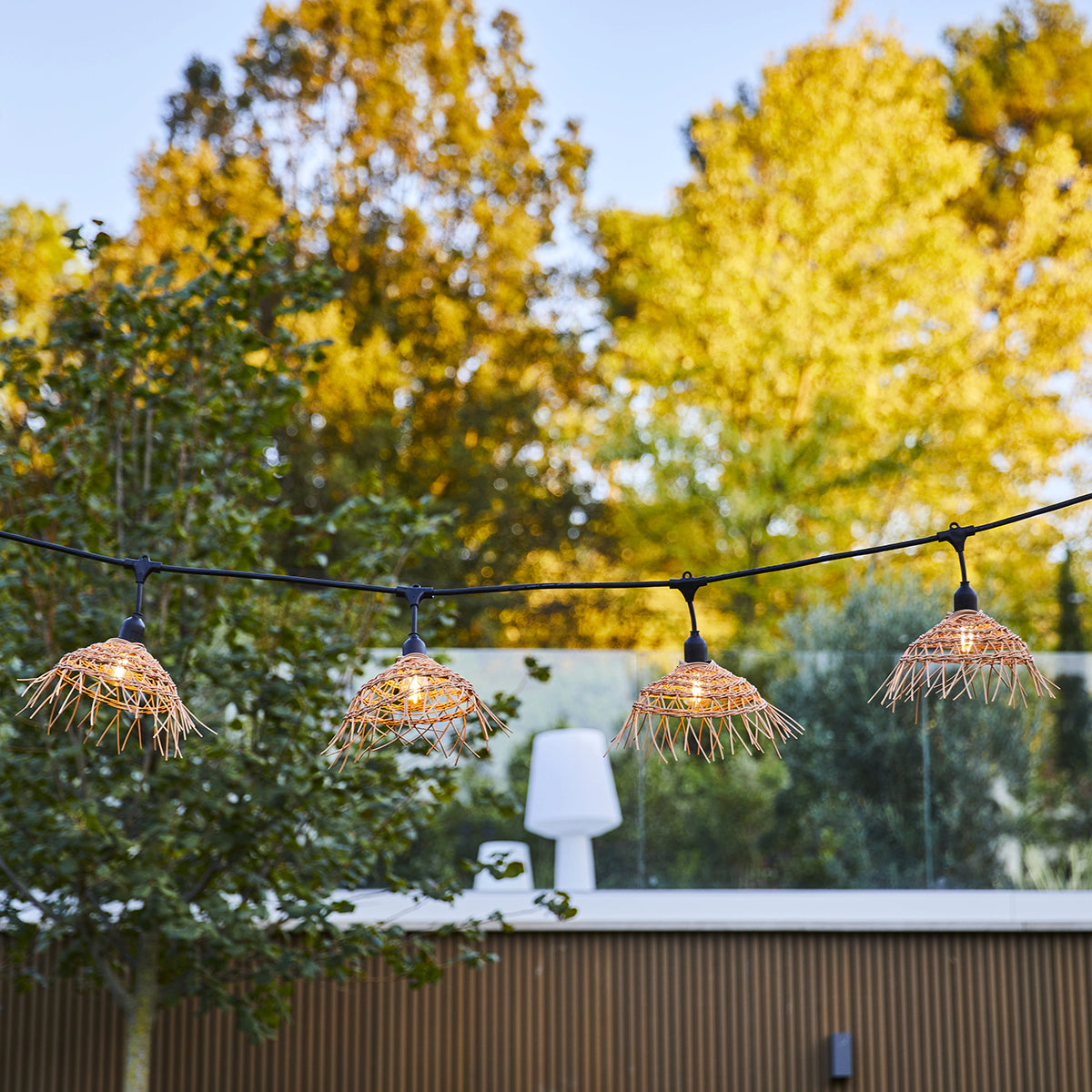 - Connectable E27 light string: Hawaii Light Connectable is a string of lights with E27 filament bulbs that have hooks so you can hang them as you wish. Thanks to its extension system, you can connect 10 strings at a time to have a nice length of cable and even more lighting. This LED string of lights with polyrattan lampshade stands out for its design that is both bohemian and trendy. It is ideal for making your evenings shine and you will love its designer and exotic side to illuminate your most beautiful events. The string Hawaii Light Connectable is the improved version of the garland Hawaii Light.