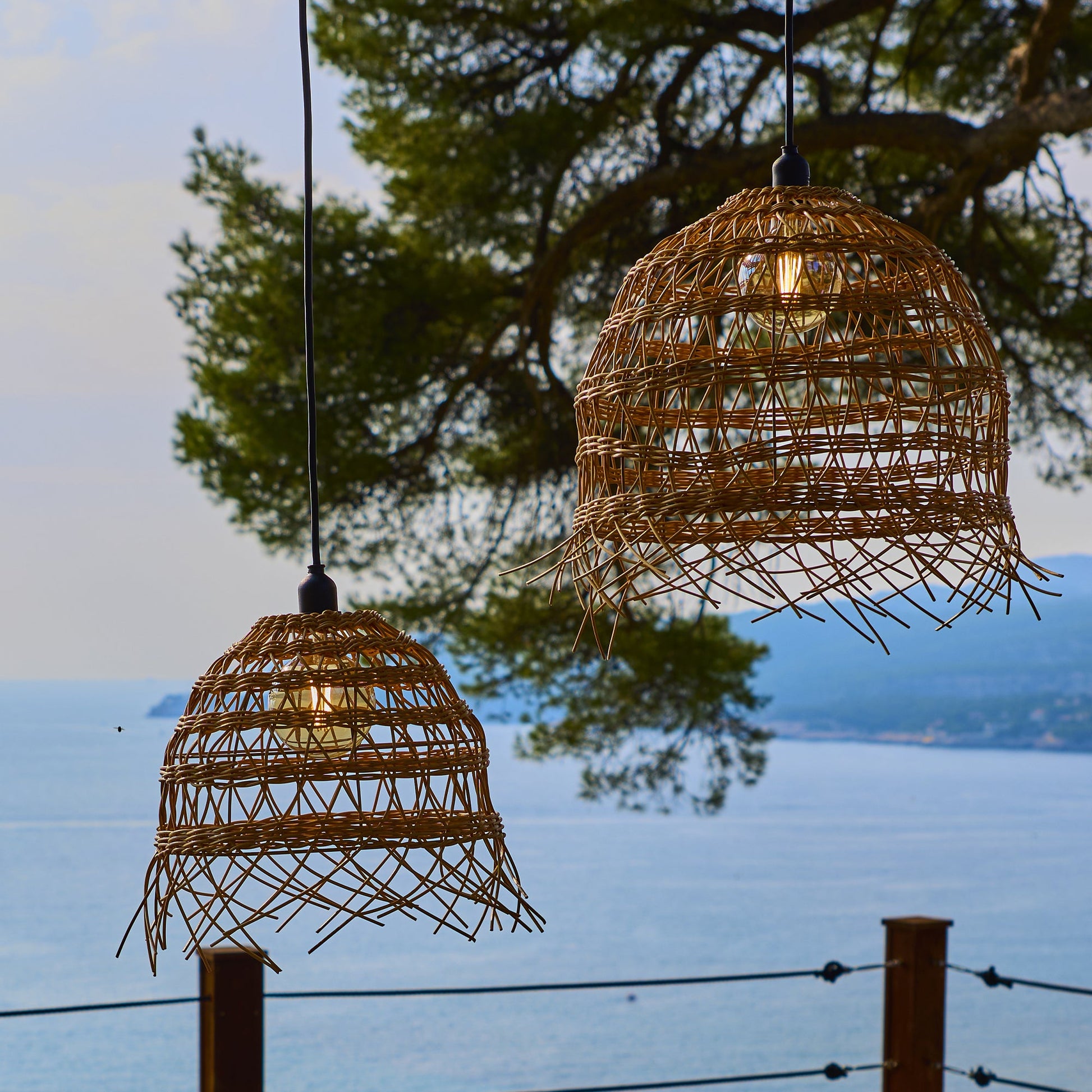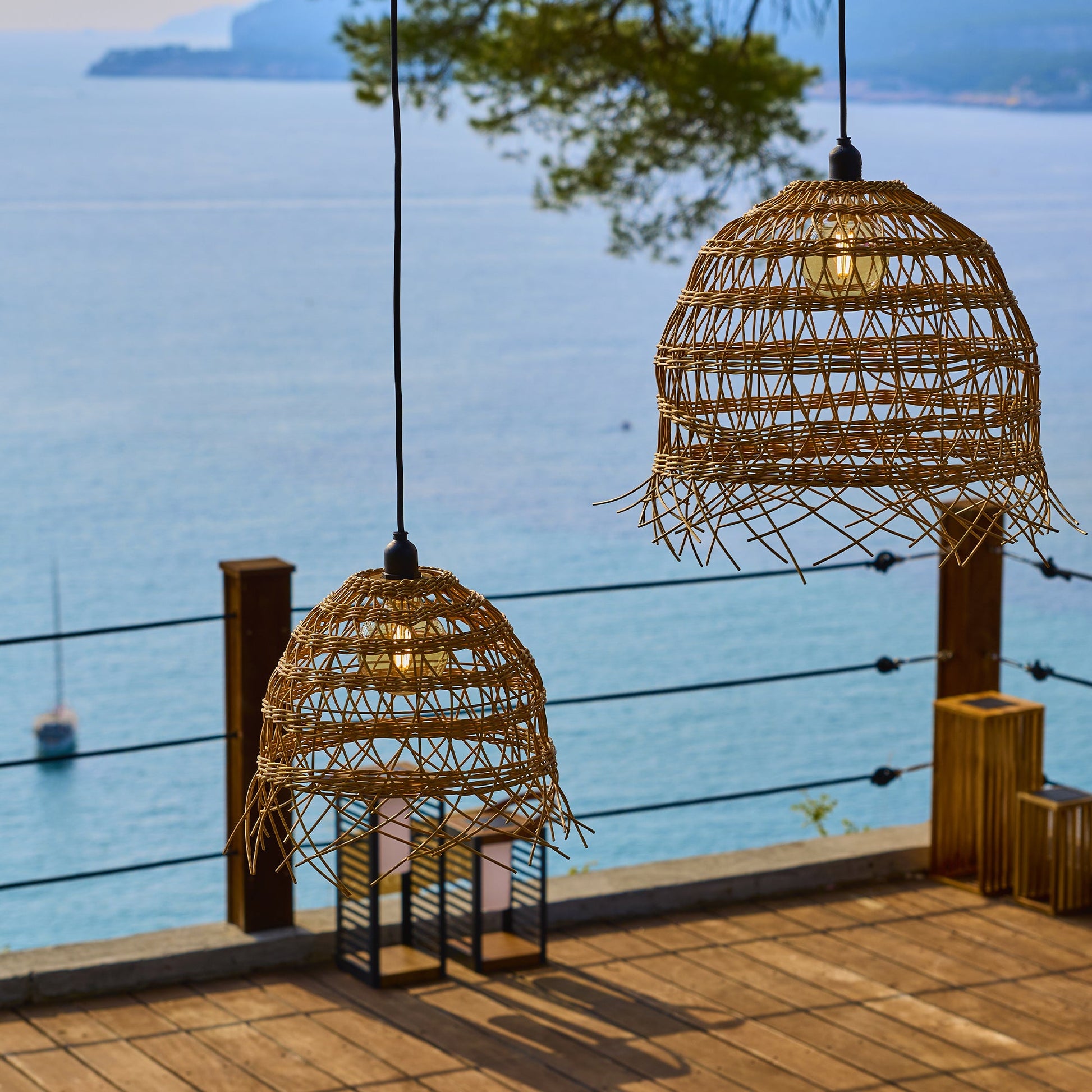 Créez une ambiance bohème chic et chaleureuse dans votre extérieur avec le Lot de 2 Abat-jours en Poly Rotin. Ces suspensions décoratives sont conçues pour offrir une flexibilité totale dans le choix de votre source lumineuse. Dimensions et Résistance : Les abat-jours sont disponibles en deux tailles (D31 x H35 cm et D41 x H45 cm) et sont fabriqués en poly rotin résistant. Grâce à la certification IP44, ils supportent parfaitement l'exposition au soleil et à la pluie, assurant une utilisation durable en extérieur. Options pour un Éclairage Sur Mesure : Le cerclage inclus vous permet de choisir la source lumineuse qui correspond à votre installation : Câble ENNA (Secteur) : Disponible en version noire ou corde décorative. Idéal pour un éclairage puissant et constant. Nécessite une ampoule E27 (25W max) de votre choix. Câble ENNA SOLAR (Hybride) : Solution solaire avec option hybride sur secteur. Équipé d'une LED intégrée de 600 Lumens. Parfait pour l'autonomie et l'efficacité. Ampoule LYS Rechargeable : Solution nomade et sans fil. Ampoule blanc et RGB avec télécommande incluse. Idéal pour varier les ambiances festives ! Ces suspensions en polyrotin garantissent un style bohème immédiat, idéales pour décorer une pergola, une terrasse ou un coin salon de jardin.