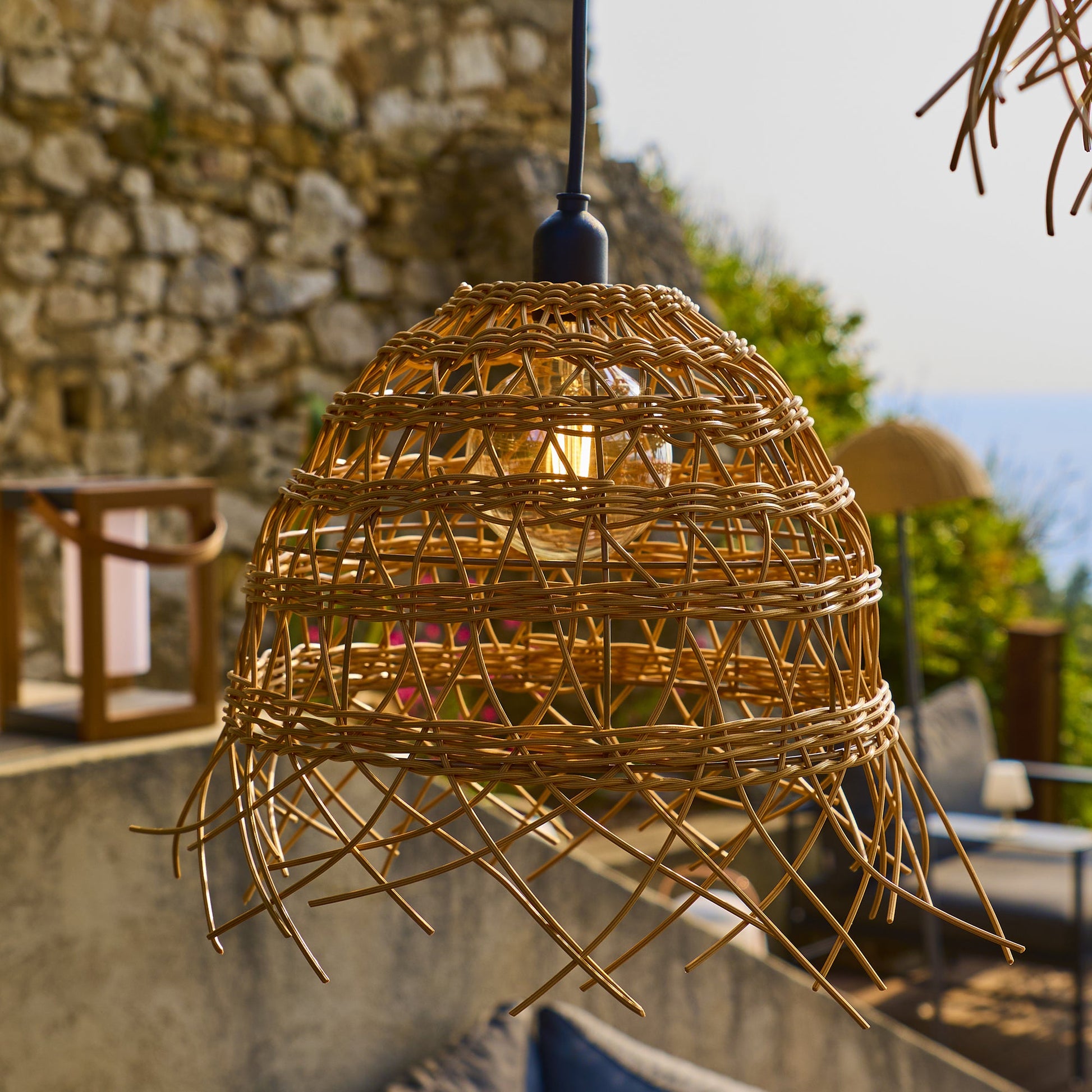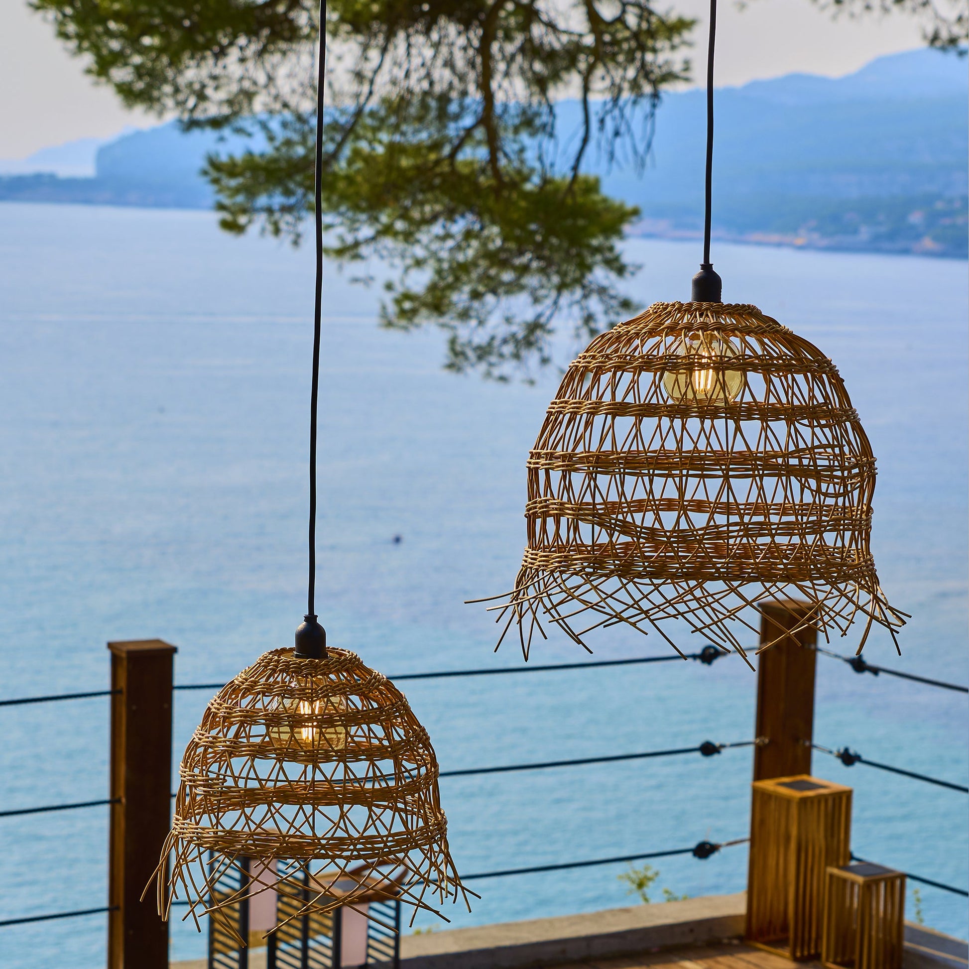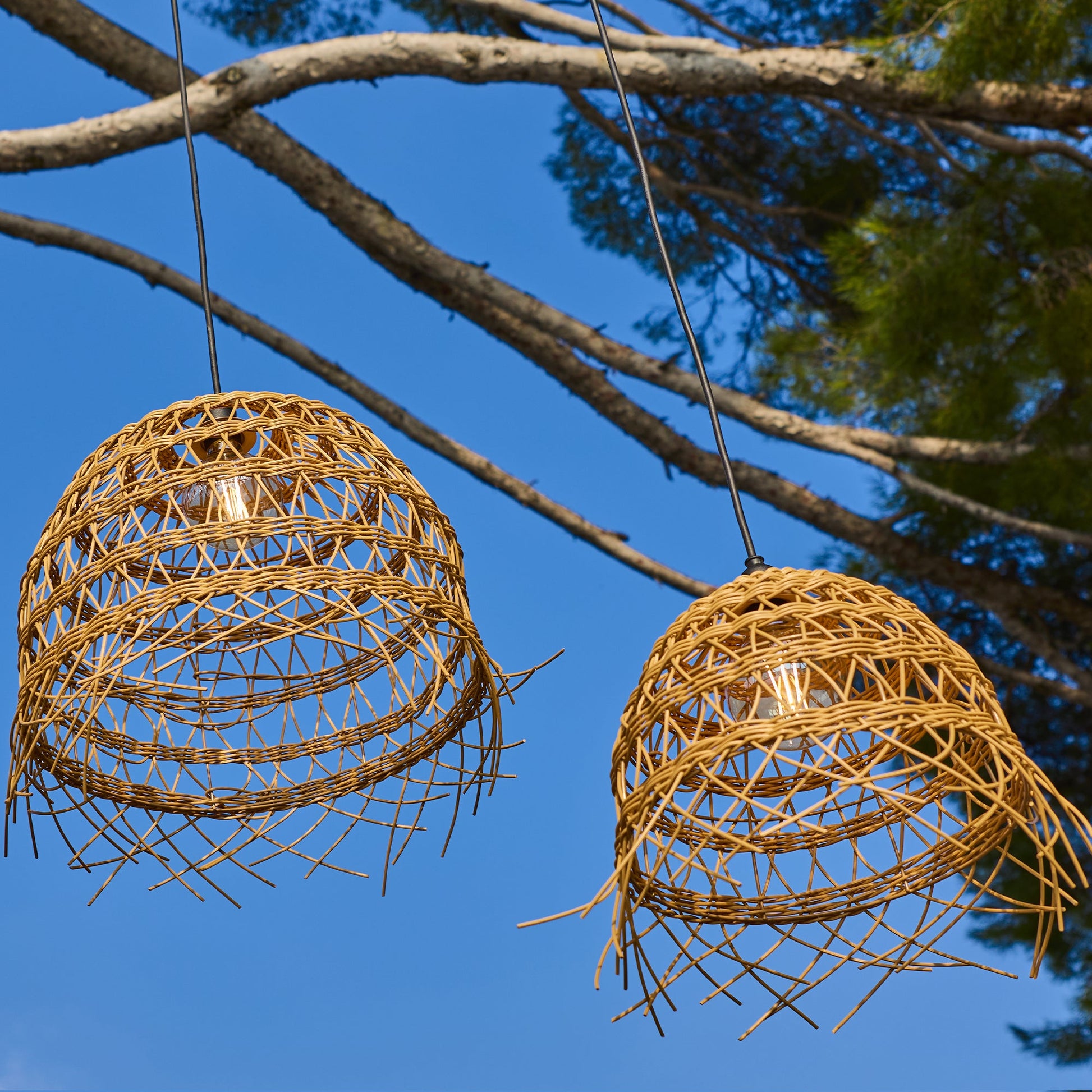 Le Lot de 2 Suspensions Extérieures 2X HAWAII LONG OUTDOOR CABLE apporte une touche ethnique chic et chaleureuse à tout espace extérieur grâce à sa fabrication en poly rotin tressé, parfaite pour un style bohème ou vintage. Ce lot décoratif comprend deux tailles distinctes (ø35 x H31 cm et ø41 x H45cm), idéales pour être suspendues sur une branche d'arbre, sous une pergola ou un parasol, créant ainsi une ambiance lumineuse unique. L'installation est sécurisée en extérieur grâce au câble de 5M et à la douille, tous deux certifiés IP64 pour une protection contre les projections d'eau, avec un raccordement filaire sur secteur (220-240V). Le système est fourni sans ampoule, vous laissant la liberté de choisir l'éclairage de votre choix sur un culot E27 (puissance maximum 25W) pour personnaliser l'atmosphère de votre terrasse ou jardin.