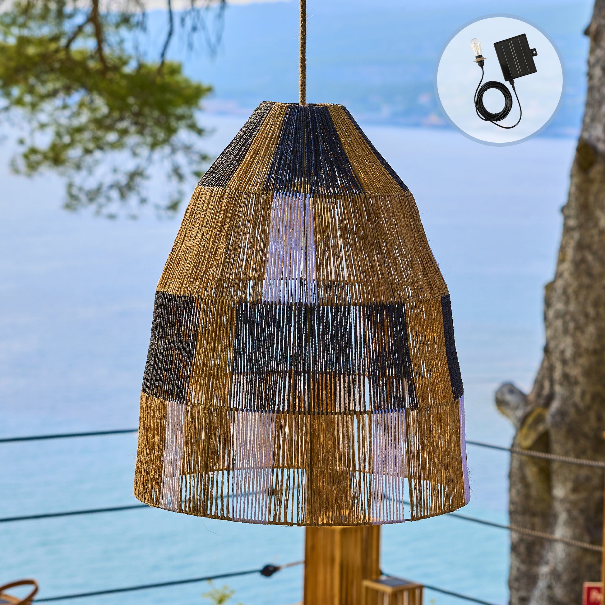 La suspension solaire ZAHARA SOLAR 5m de longueur (Dimensions : 50 x H58 cm), est une création artisanale en corde naturelle. Elle diffuse une lumière LED blanc chaud et apporte une touche exotique et chaleureuse à votre décoration. Son tressage unique et son style ethnique chic s'intègrent à merveille dans les ambiances modernes, bohèmes ou vintage. La ZAHARA SOLAR est fournie avec son câble d'extérieur hybride ENNA SOLAR, doté d'une ampoule LED intégrée et remplaçable. Ce système vous offre la liberté de choix : Par recharge solaire ou secteur 220-240V. L'ampoule offre une puissance lumineuse de 600 lumens et une lumière blanc chaud. De plus, elle est dimmable et propose 4 niveaux d'intensité pour s'adapter parfaitement à l'ambiance souhaitée. Profitez de vos soirées en toute tranquillité. La suspension ZAHARA SOLAR bénéficie d'une autonomie exceptionnelle de près de 8 heures une fois chargée au maximum (que ce soit par énergie solaire ou via secteur). Le temps de charge complet est de 6 à 8 heures via solaire. Un voyant de niveau de batterie intégré vous permet de vérifier facilement l'énergie restante. Grâce à sa conception sans fil et son système de recharge hybride, la ZAHARA SOLAR est idéale partout : sur votre terrasse, votre balcon, ou dans votre salon. La corde naturelle est un matériau résistant et durable. Conseil d'entretien : Pour préserver l'abat-jour, il est recommandé de le suspendre à l'abri de l'humidité et de la pluie.